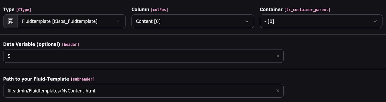 }Im CE "Fluidtemplate" unter "Path to your Fluid-Template" folgendes eintragen (s. Screenshot): fileadmin/Fluidtemplates/MyContent.html