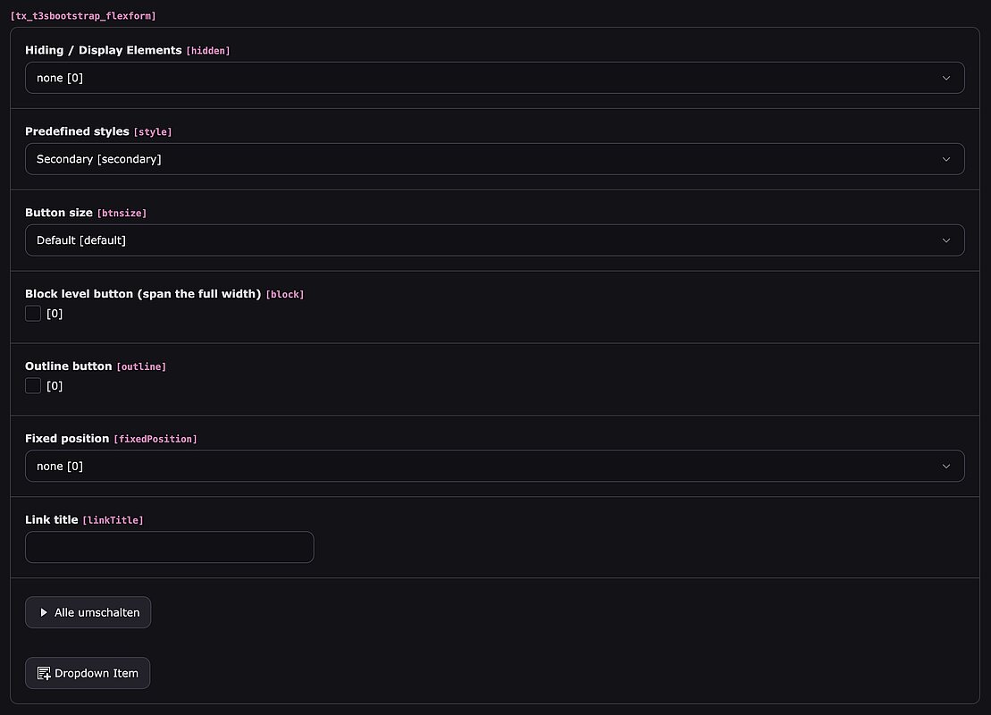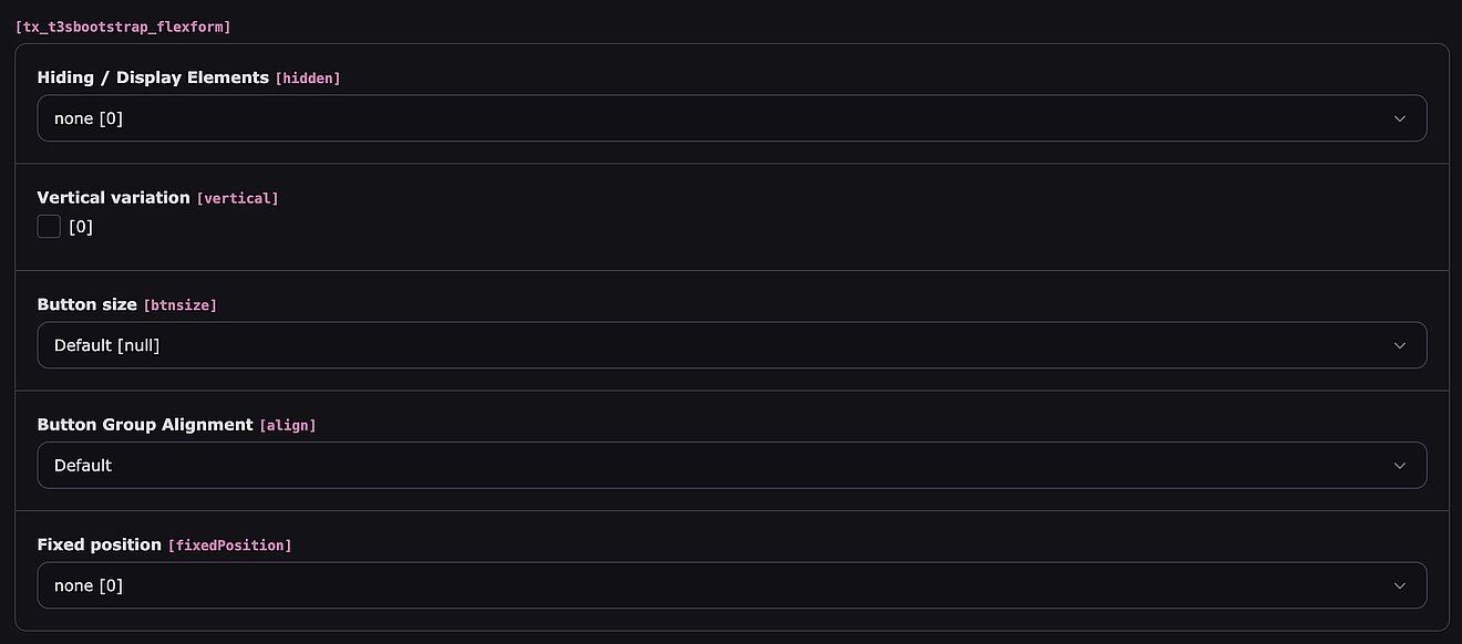 Horizontale/Vertikale Ausrichtung: Über eine Flexform-Einstellung wird zwischen .btn-group und .btn-group-vertical gewechselt.