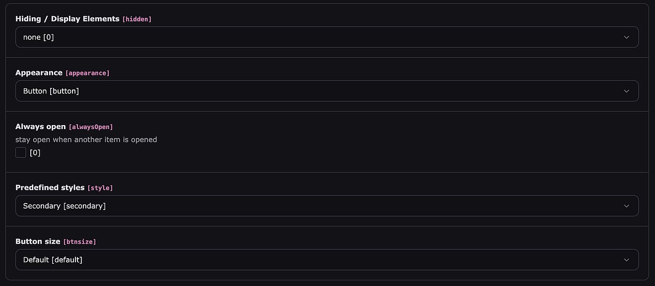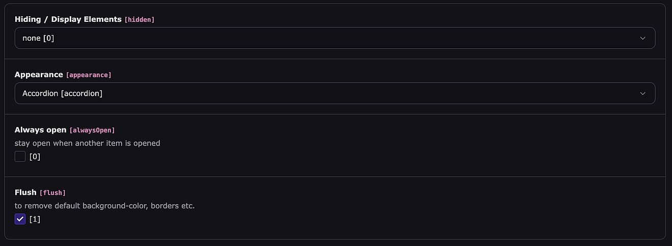 Optionen, wie z. B. "Flush" (randloses Design) oder ob immer nur ein Item gleichzeitig geöffnet sein darf (Auto-Close).