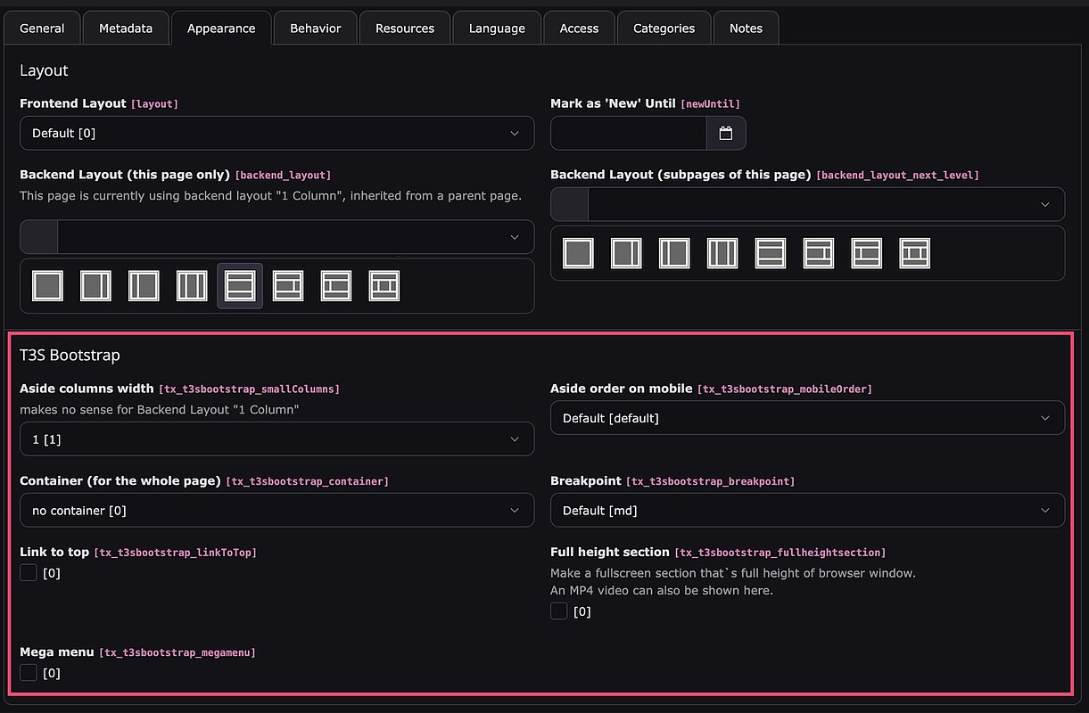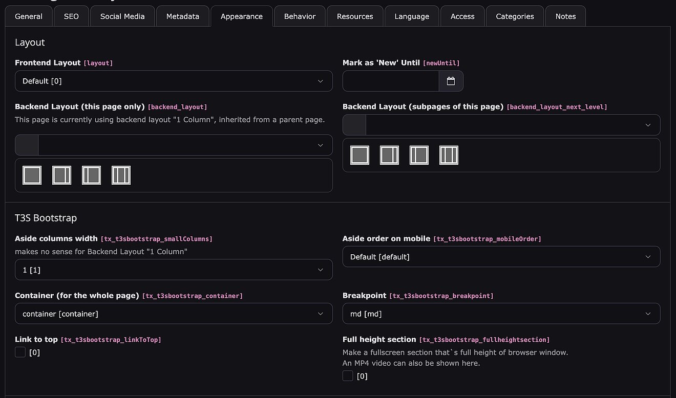 Es stehen dir für die Konfiguration der Backend-Layouts und der Seitenstruktur im Reiter "Erscheinungsbild" folgende Optionen zur Verfügung: