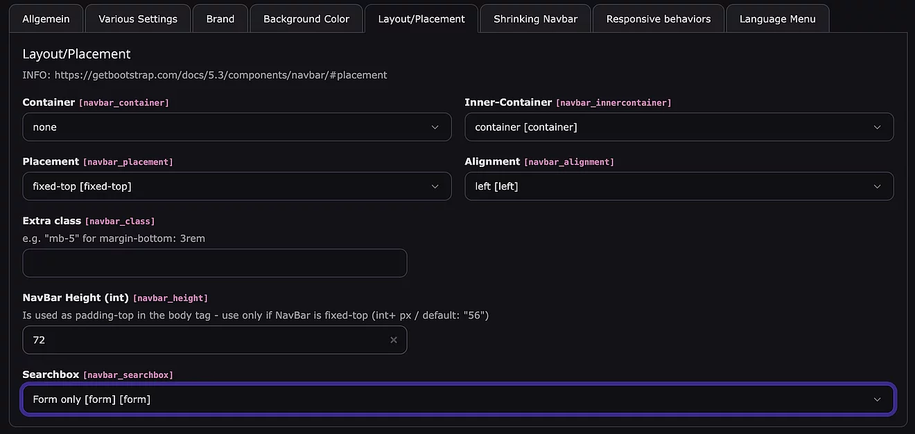 Wenn die System Extension "Indexed Search Engine" in der Site Konfiguration eingebunden wurde, erscheint im Backend Modul "T3SB Config" unter "Navbar -> Layout/Placement" die Auswahlliste "Searchbox".
